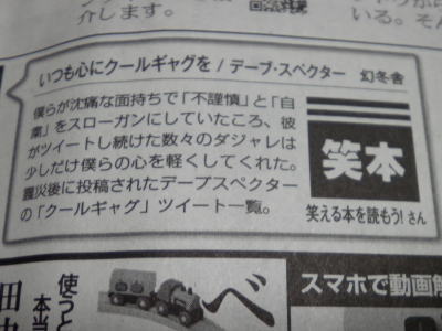 さて、本書「いつも心にクールギャグを」は、震災直後の12日からデーブ・スペクターがツイッター上でつぶやき続けたダジャレ、ジョークを1冊の本にまとめたものだ。